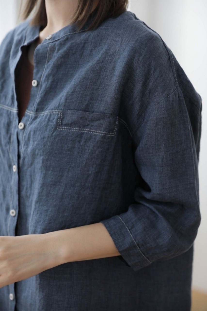 ➽亞麻素材涼爽感與高級感兼具,採用簡單無領、七分袖、胸前口袋線條、前短後長開邊岔剪裁設計,輕鬆打造時尚經典外觀。