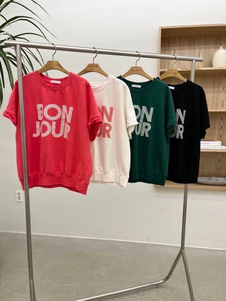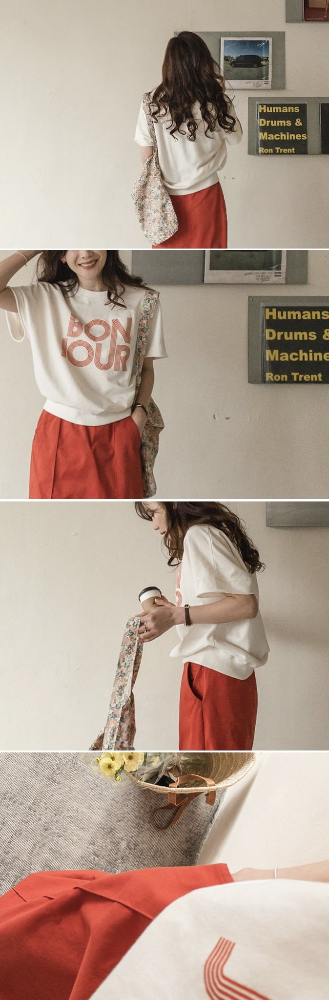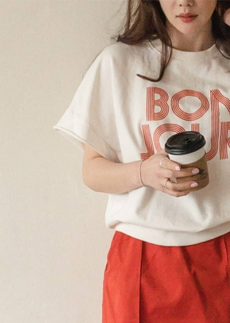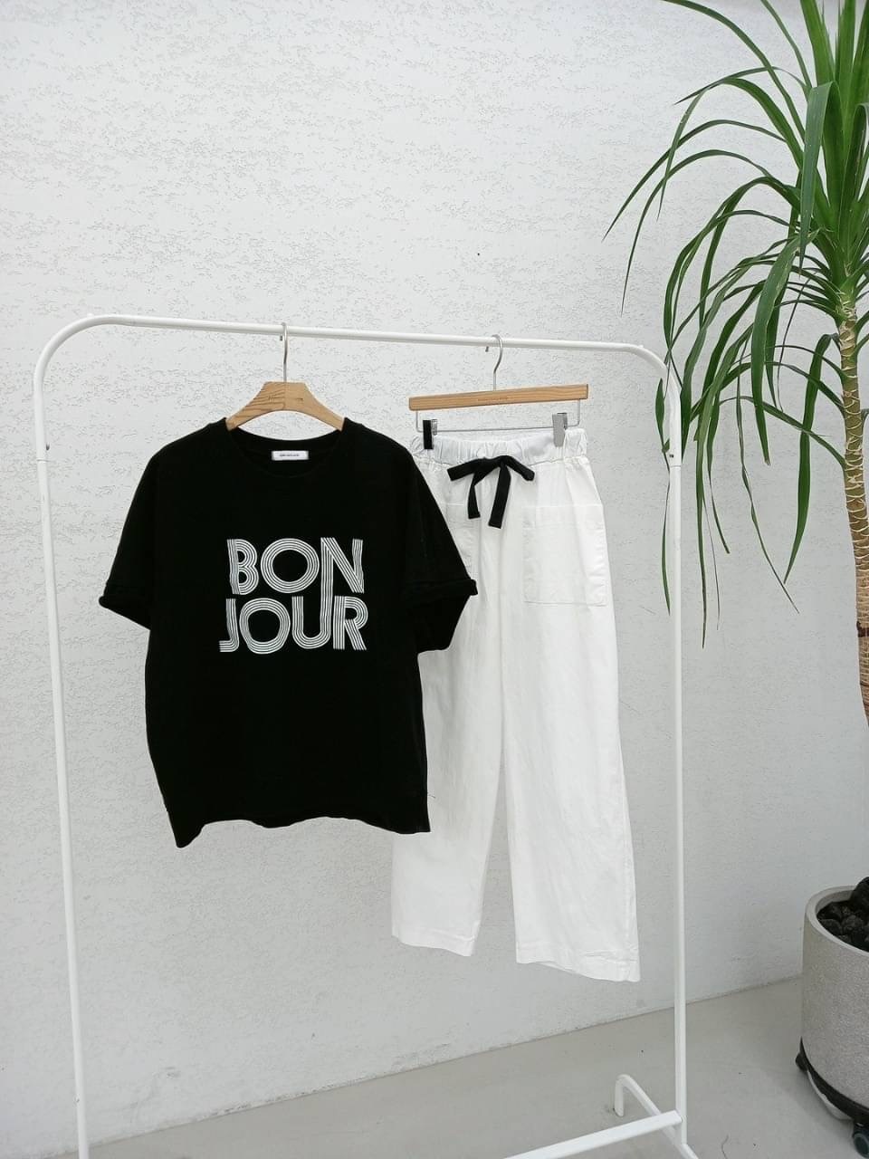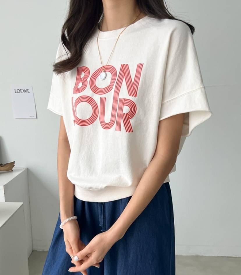 ➽胸前的BONJOUR英文字母,增加了整體的活潑度,沒有過多的裝飾看起來更減齡,夏日穿著更休閒亮眼。