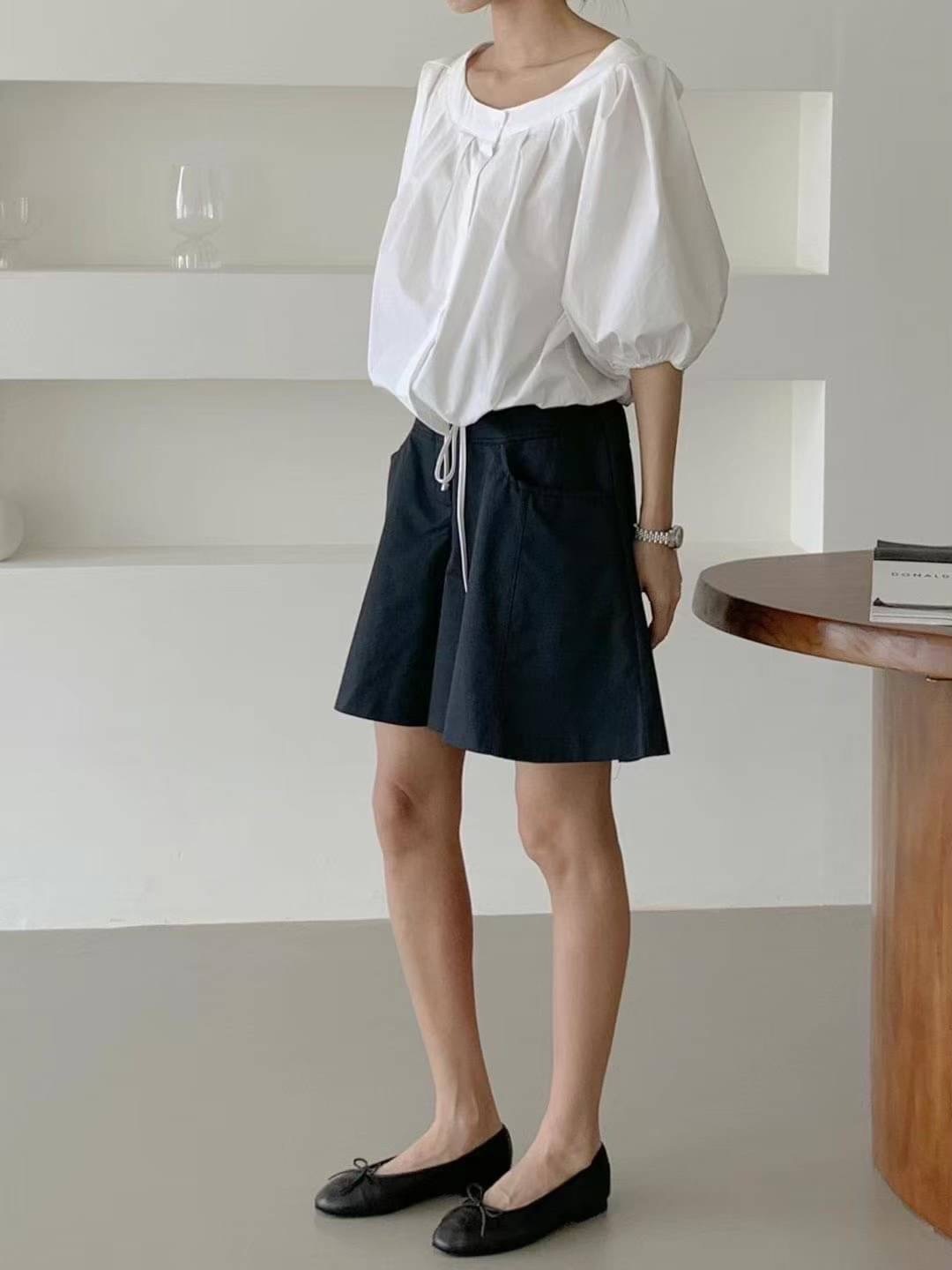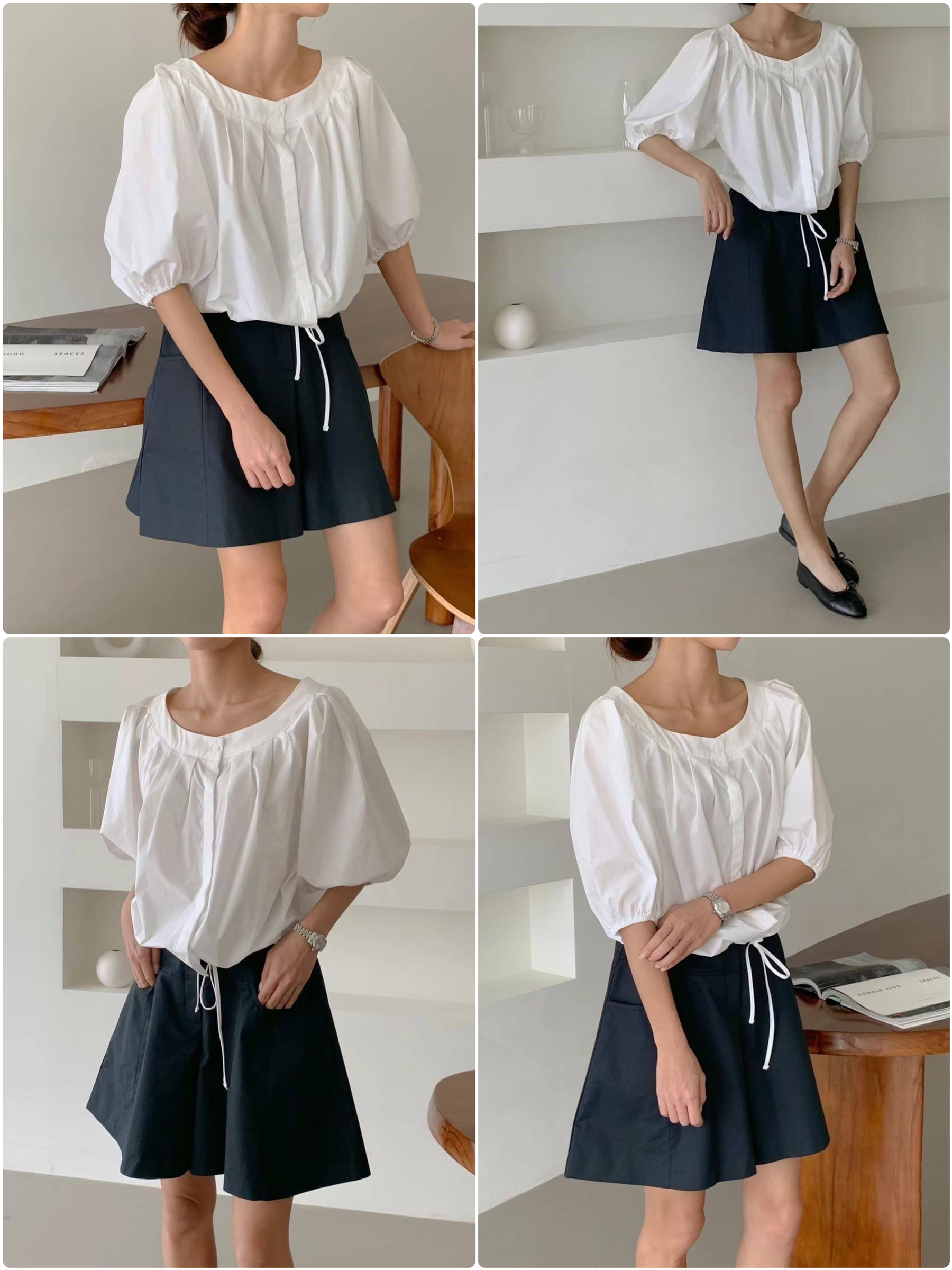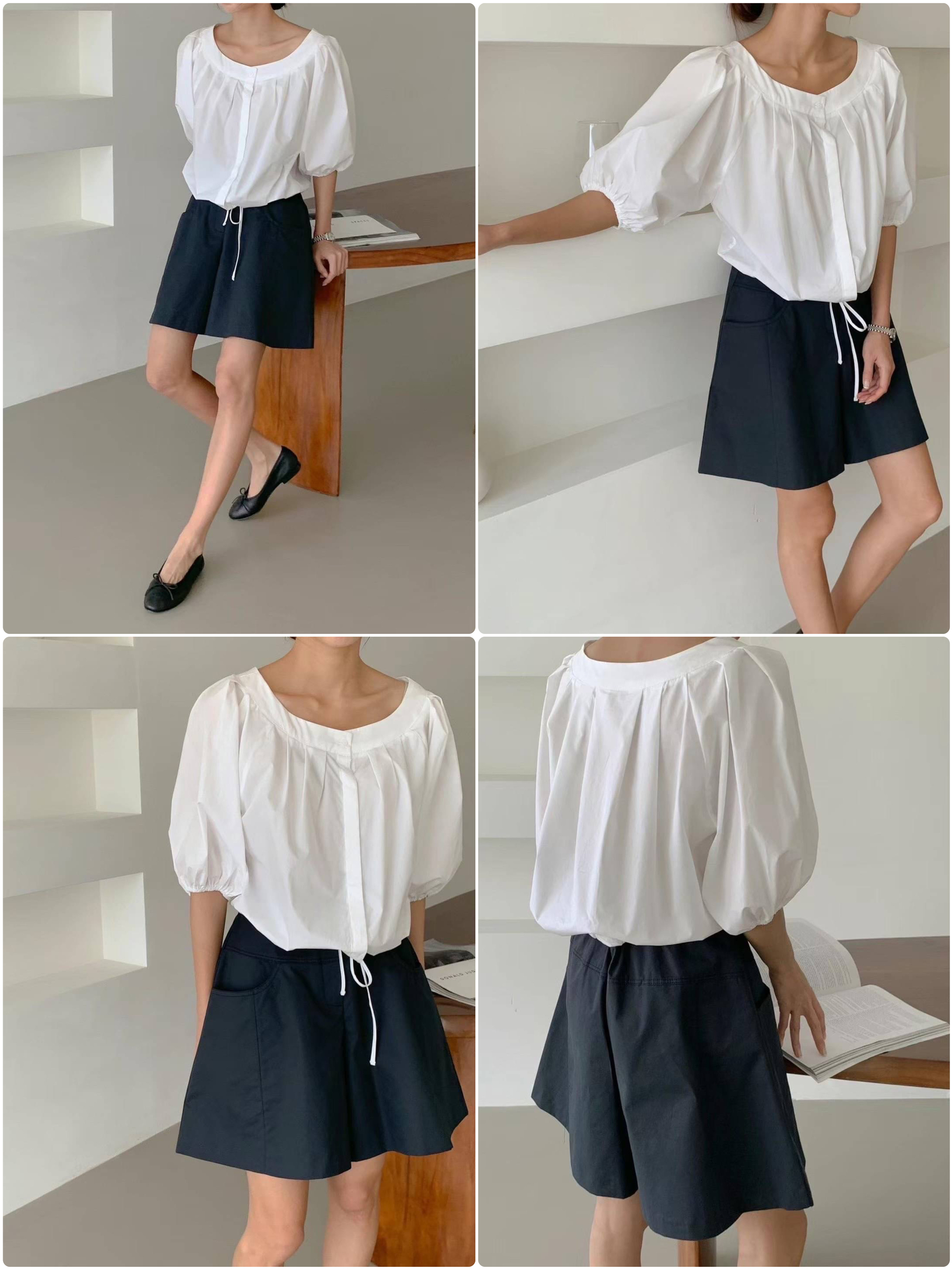 🇰🇷正韓大圓領壓褶五分花苞袖綁帶襯衫[3色]